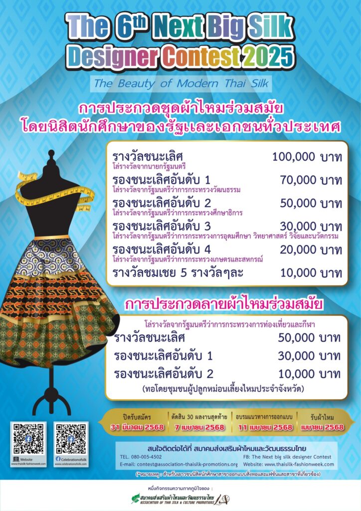 ขอเรียนเชิญ นักเรียน นิสิต นักศึกษา ที่กำลังศึกษาคณะแฟชั่นสิ่งทอ หรือ Textile เข้าร่วมประกวด The Next Big Silk Designer Contest ครั้งที่ 6 ประจำปี 2568 ชิงรางวัลรวมมูลค่า 400,000 บาท