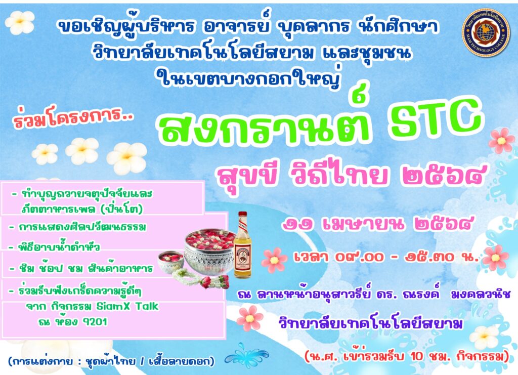 วิทยาลัยเทคโนโลยีสยาม ขอเชิญชวนผู้บริหาร อาจารย์ บุคลากร และนักศึกษา เข้าร่วมโครงการ ‘สงกรานต์ STC สุขขี วิถีไทย 2568’ ในวันที่ 11 เมษายน 2568 ตั้งแต่เวลา 19:00 – 15:30 น. ณ ลานหน้าอนุสาวรีย์ ดร.ณรงค์ มงคลวนิช วิทยาลัยเทคโนโลยีสยาม