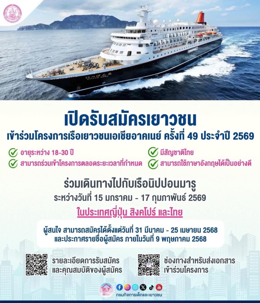 กรมกิจการเด็กและเยาวชน เปิดรับสมัครเยาวชนไทยร่วม “โครงการเรือเยาวชนเอเชียอาคเนย์ ครั้งที่ 49” ประจำปี 2569
