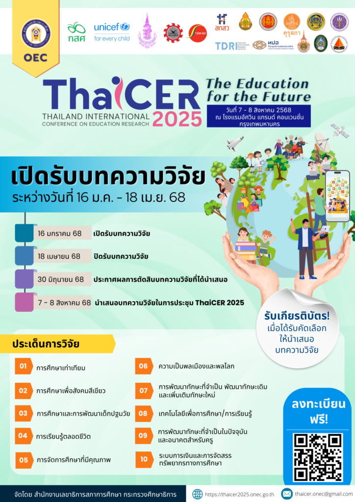 ประชาสัมพันธ์เชิญชวนเข้าร่วมส่งบทความวิจัยในระดับชาติและนานาชาติ เพื่อคัดเลือกให้นำเสนอในการประชุม Thailand International Conference on Education Research (ThaiICER) 2025สถาบันวิจัยและพัฒนา มหาวิทยาลัยสวนดุสิต ขอประชาสัมพันธ์เชิญชวน คณาจารย์ นักวิจัย นักวิชาการ นิสิต/นั…