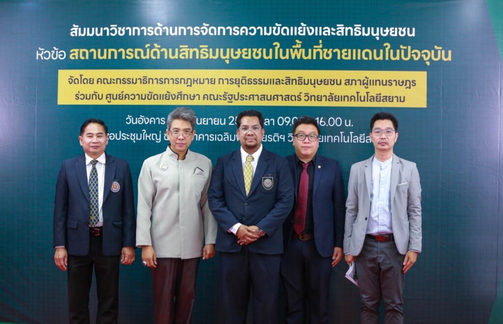 ภาพบรรยากาศกิจกรรมเสวนาวิชาการด้านการจัดการความขัดแย้งและสิทธิมนุษยชน โดย คณะกรรมาธิการการกฎหมาย การยุติธรรมและสิทธิมนุษยชน สภาผู้แทนราษฎร ร่วมกับ ศูนย์ความขัดแย้งศึกษา คณะรัฐประศาสนศาสตร์ วิทยาลัยเทคโนโลยีสยาม ในหัวข้อ “สถานการณ์สิทธิมนุษยชนในพื้นที่ชายแดนในปัจจุบัน” ในวันอังคาร ที่ 10 กันยายน 2567 ณ หอประชุมใหญ่ อาคารเฉลิมพระเกียรติฯ วิทยาลัยเทคโนโลยีสยาม