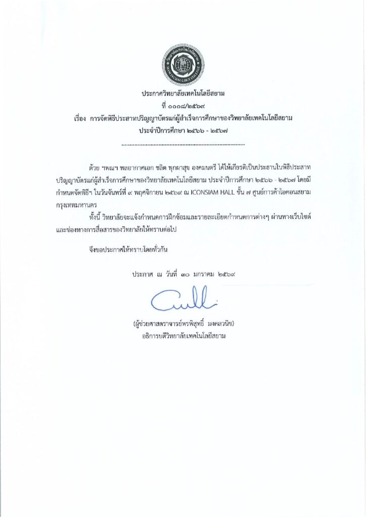 วิทยาลัยเทคโนโลยีสยาม กำหนดจัดพิธีประสาทปริญญาบัตรแก่ผู้สำเร็จการศึกษา ประจำปีการศึกษา 2566–2567 โดย…